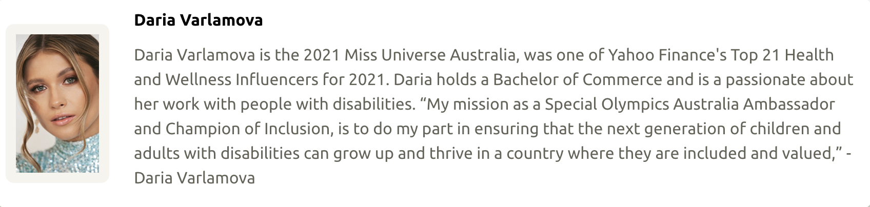 Appointed as an ambassador for Special Olympics Australia in 2022, she works to highlight the strengths and achievements of athletes with intellectual disabilities and to encourage organisations to build environments where every individual feels valued and supported.